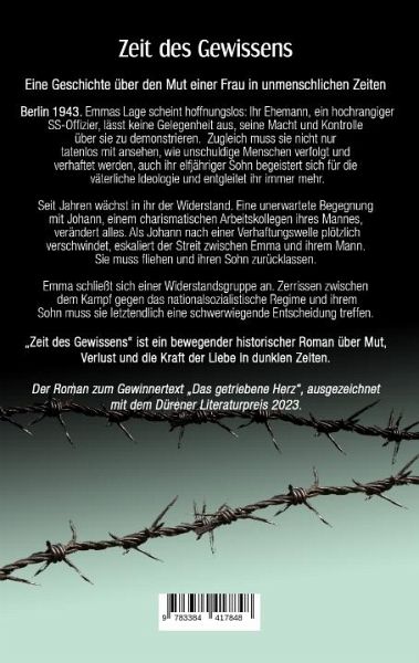 Eine Geschichte über den Mut einer Frau in unmenschlichen Zeiten.Berlin 1943. Emmas Lage scheint hoffnungslos: Ihr Ehemann, ein hochrangiger SS-Offizier, lässt keine Gelegenheit aus, seine Macht und Kontrolle über sie zu demonstrieren. Zugleich muss sie nicht nur tatenlos mit ansehen, wie unschuldige Menschen verfolgt und verhaftet werden, auch ihr elfjähriger Sohn begeistert sich für die väterliche Ideologie und entgleitet ihr immer mehr.Seit Jahren wächst in ihr der Widerstand. Eine unerwartete Begegnung mit Johann, einem charismatischen Arbeitskollegen ihres Mannes, verändert alles. Als Johann nach einer Verhaftungswelle plötzlich verschwindet, eskaliert der Streit zwischen Emma und ihrem Mann. Sie muss fliehen und ihren Sohn zurücklassen.Emma schließt sich einer Widerstandsgruppe an. Zerrissen zwischen dem Kampf gegen das nationalsozialistische Regime und ihrem Sohn muss sie letztendlich eine schwerwiegende Entscheidung treffen."Zeit des Gewissens" ist ein bewegender historischer Roman über Mut, Verlust und die Kraft der Liebe in dunklen Zeiten.Der Roman zum Gewinnertext "Das getriebene Herz", ausgezeichnet mit dem Dürener Literaturpreis 2023.