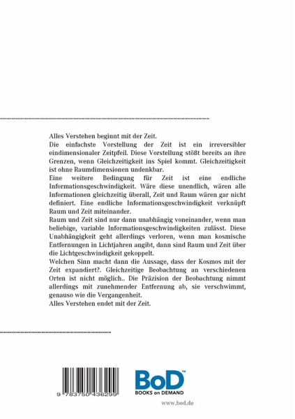 Alles Verstehen beginnt mit der Zeit.Die einfachste Vorstellung der Zeit ist ein irreversibler eindimensionaler Zeitpfeil. Diese Vorstellung stößt bereits an ihre Grenzen, wenn Gleichzeitigkeit ins Spiel kommt. Gleichzeitigkeit erfordert unterschiedliche Orte, ist ohne Raumdimensionen undenkbar.Eine weitere Bedingung für Zeit ist eine endliche Informationsgeschwindigkeit. Wäre diese unendlich, wären alle Informationen gleichzeitig überall, Zeit und Raum wären gar nicht definiert. Eine endliche Informationsgeschwindigkeit verknüpft Raum und Zeit miteinander. Raum und Zeit sind demnach keine voneinander unabhängigen Parameter.Raum und Zeit sind nur dann unabhängig voneinander, wenn man beliebige, variable Informationsgeschwindigkeiten zulässt. Diese Unabhängigkeit geht allerdings verloren, wenn man kosmische Entfernungen in Lichtjahren angibt, dann sind Raum und Zeit über die Lichtgeschwindigkeit gekoppelt.Welchen Sinn macht dann die Aussage, dass der Kosmos mit der Zeit expandiert? Das ist keine Frage der Physik, sondern der Logik. Gleichzeitige Ereignisse lassen sich nur auf einen eindimensionalen Zeitpfeil projizieren, wenn diese auch gleichzeitig beobachtet werden können. Die Präzision der Beobachtung nimmt allerdings mit zunehmender Entfernung ab, sie verschwimmt, genauso wie die Vergangenheit.Alles Verstehen endet mit der Zeit.
