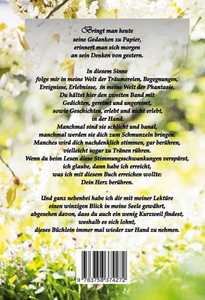 Natur, Gedanken, Träume: Lyrik und Geschichten für deine Auszeit.»Zeit für mich« ist ein Doppelband mit Gedichten und Geschichten, die ich mit Schwarz-Weiß-Bildern zu den vier Jahreszeiten kombiniert habe.Mit diesem Band 2 tauchst du ein in die grüne Natur und die Schönheit, die von Wäldern, Feldern, Wiesen und Seen ausgeht. In den Geschichten erzähle ich von Erlebtem, von meinen Gedanken und Träumen und vielleicht sagst du hier und da: »Ja, das kenne ich auch« oder »Das war schön«. »Zeit für mich« ist ein Doppelband zum Entspannen, zum Lesen zwischendurch, zum Beiseitelegen und jederzeit wieder Herausholen.