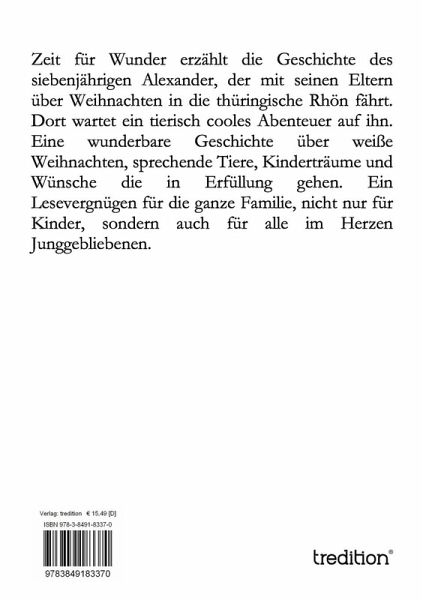 Als Alexander erfährt, dass er mit seinen Eltern über Weihnachten zu Oma und Opa verreisen wird, freut er sich wie ein Schneekönig. Oma und Opa wohnen nämlich in einem ganz kleinen Dorf in der Rhön, wo es viele Berge, viele Wälder, viele Tiere und zu Weihnachten meistens viel Schnee gibt. Alexander ist in einer Stadt am Rande des Ruhrgebietes zu Hause. Ja und da könnte man doch oft , was das Wetter zu Weihnachten betrifft, auf die Idee kommen, Ostern wäre angesagt. Schon die Vorbereitungen und die Fahrt entwickeln sich zu einem mittleren Chaos und Mama ist kurz davor eine Krise zu bekommen. Klar, dass diesmal keine gewöhnlichen Weihnachtstage vor der Tür stehen! Kaum ist die Familie in der Rhön angekommen, rieseln auch schon dicke Schneeflocken vom Himmel. Und gleich die erste Nacht bei den Großeltern wird zu einem tierischen Abenteuer.Weihnachten ist eben viel mehr als nur Weihnachtsmann, Tannenbaum, Lichterketten und Geschenke.Es ist Zeit für Wunder!