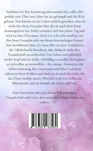 Nachdem Liv ihre Essstörung überwunden hat, sollte alles perfekt sein. Über zwei Jahre hat sie gekämpft und die Welt gehasst. Nun könnte sie das Leben endlich genießen, wäre da nicht ihre beste Freundin Mia, die sie nach ihrer Krise kennengelernt hat. Emily verändert sich mit jedem Tag und wird zu einer Partymaus. Doch Liv will nicht zusehen, wie ihre beste Freundin sich von ihrem feiersüchtigen Freund Sam beeinflussen lässt. Liv muss Mia vor dem Teufelskreis der Alkoholsucht bewahren, aber dadurch droht ihre Freundschaft zu zerbrechen. Livs Leben steht plötzlich wieder Kopf und sie droht, rückfällig zu werden. Sie beginnt, an sich selbst zu verzweifeln - ihr einziger Ausweg ist die Selbstverletzung. Ihre Depression und Mias Verhalten zehren an ihren Kräften und dann ist da noch die Liebe, die das Chaos perfekt macht. Plötzlich steht Livs Leben im Mittelpunkt und sie kämpft um Leben und Tod.Eine Geschichte über psychische Erkrankungen, Freundschaft und Liebe, aber auch die schönen Seiten des Lebens.