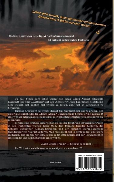 Lieber Afrika-Fan und Reisefreund!Dieses Buch, eine der letzten verwirklichten Ostrouten-Befahrung Afrikas, soll dich mit auf diesen Abenteuerrittnehmen, um bei dir nicht nur neue Impulse zu setzen,sondern auch um im Detail der Erzählungen das zureflektieren, was gerade Afrika so facettenreich, jaeinzigartig macht.Genieße unsere spannende Trans-Afrika-Durchquerung.Es sollen unsere ersten bunten wie aufregenden 159Reisetage eines neuen Lebensabschnittes werden, mitder Spannung eines Krimis und dem Farbspektrumeines Chamäleons- hautnah, querdurch und mittendrin.Mit vielen Insider & Reise-Vorbereitungs-Tips, lernt Ihrauf dieser Reise, wie man mit den einen oder anderenvertrackten Situationen gut fertig werden kann.
