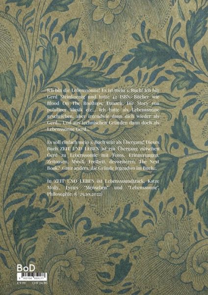 Ich bin die Lebenssonne! Es ist mein 1. Buch! Ich bin Gerd Steinkoenig und hatte 42 ISBN-Bücher wie Blood On The Rooftops, Danach, Die Story von polulärer Musik etc... Ich hatte als Lebenssonne geschrieben, aber irgendwie dann dich wieder als Gerd... Und aus technischen Gründen dann doch als Lebenssonne Gerd...Es soll einfach mein 1. Buch sein als Übergang! Dieses Buch ZEIT UND LEBEN ist ein Übergang zwischen Gerd zu Lebenssonne mit Fotos, Erinnerungen, Zeitoasen, Musik, Freiheit, desweiteren. The Next Book? Ganz anders, die Gründe irgendwo im Buch... In "Zeit und Leben" ist Lebenssoundtrack, Katze Molly, Lyrics "Menschen" und "Lebenssonne", Philosophie. (C 29.10.2022)