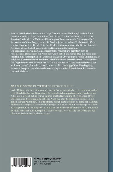 Die konsequent narratologisch ausgerichtete Fragestellung wird mit den soziologischen Überlegungen Niklas Luhmanns zur religiösen Kommunikation und ihrer Leitdifferenz von Immanenz und Transzendenz, zudem mit Paul Ricoeurs Reflexionen zur Aporie der Zeitlichkeit und seiner Idee der narrativen Identität verknüpft. Die Organisation und Struktur der Erzählung werden auf diese Weise mit der für den Parzival relevanten Frage nach den Unverfügbarkeitskonstruktionen enggeführt. Damit gelingt eine neue Perspektive auf einen der bedeutendsten Romane des Hochmittelalters. Beispielhaft vorgeführt wird zudem, wie der wechselseitige Zusammenhang von Zeit, Erzählung und Lebenszeit des Helden analytisch gefasst werden kann.