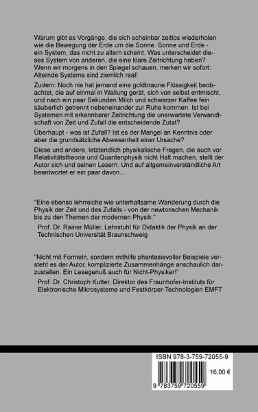 Warum gibt es Vorgänge, die sich scheinbar zeitlos wiederholen wie die Bewegung der Erde um die Sonne. Sonne und Erde - ein System, das nicht zu altern scheint. Was unterscheidet dieses System von anderen, die eine klare Zeitrichtung haben? Wenn wir morgens in den Spiegel schauen, merken wir sofort: Alternde Systeme sind ziemlich real!Zudem: Noch nie hat jemand eine goldbraune Flüssigkeit beobachtet, die auf einmal in Wallung gerät, sich von selbst entmischt, und nach ein paar Sekunden Milch und schwarzer Kaffee fein säuberlich getrennt nebeneinander zur Ruhe kommen. Ist bei Systemen mit erkennbarer Zeitrichtung die unerwartete Verwandtschaft von Zeit und Zufall die entscheidende Zutat?Überhaupt - was ist Zufall? Ist es der Mangel an Kenntnis oder aber die grundsätzliche Abwesenheit einer Ursache?Diese und andere, letztendlich physikalische Fragen, die auch vor Relativitätstheorie und Quantenphysik nicht Halt machen, stellt der Autor sich und seinen Lesern. Und auf allgemeinverständliche Art beantwortet er ein paar davon...