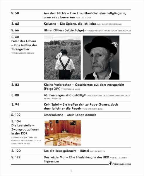 * Titelthema: Tod einer Hexe * 20 Quadratmeter Angst - Ein Einbruch an Weihnachten und seine Folgen * Aus dem Nichts - Eine Frau überfährt eine Fußgängerin, ohne es zu bemerken * Kein Spiel - Sie treffen sich zu Rape-Games, doch dann bricht er die Regeln * Das letzte Mal - Eine Hinrichtung in der BRD Tod einer Hexe Unsere Titelgeschichte widmet sich spektakulären Fällen junger Frauen, die keinen Lebensmut mehr hatten - und sich selbst als Hexen bezichtigten, in der Hoffnung, auf dem Scheiterhaufen verbrannt zu werden. Eine erschütternde Recherche darüber, wie Verzweiflung so weit führen kann und welche Abgründe sich dahinter verbergen. Außerdem in dieser Ausgabe: Warum kommt es in Deutschland immer wieder zu brutalen Gewalttaten gegen Obdachlose? Eine wichtige Geschichte geht der Frage nach, wer die Schwächsten unserer Gesellschaft angreift - und woher der Hass auf Schutzlose stammt. Ich wünsche Ihnen anregende und nachdenkliche Lesestunden! Chefredakteur Daniel Müller