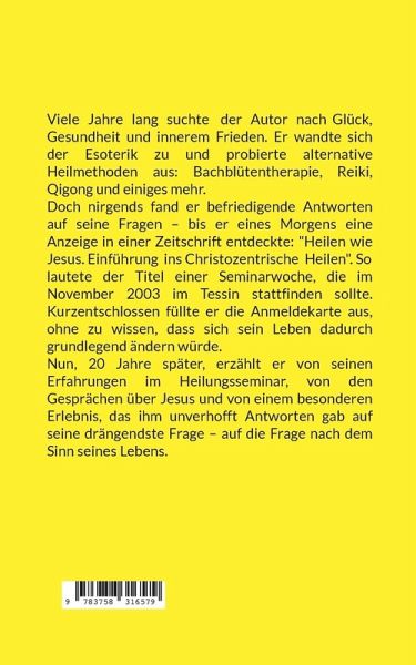 Viele Jahre lang suchte der Autor nach Glück, Gesundheit und innerem Frieden. Er wandte sich der Esoterik zu und probierte alternative Heilmethoden aus: Bachblütentherapie, Reiki, Qigong und einiges mehr. Doch nirgends fand er befriedigende Antworten auf seine Fragen - bis er eines Morgens eine Anzeige in einer Zeitschrift entdeckte: »Heilen wie Jesus. Einführung ins Christozentrische Heilen.« So lautete der Titel einer Seminarwoche, die im November 2003 im Tessin stattfinden sollte. Kurzentschlossen füllte er die Anmeldekarte aus, ohne zu wissen, dass sich sein Leben dadurch grundlegend verändern würde... Nun, 20 Jahre später erzählt er von seinen Erfahrungen im Heilungsseminar, von den Gesprächen über Jesus und von einem besonderen Erlebnis, das ihm unverhofft Antworten gab auf seine drängendste Frage - auf die Frage nach dem Sinn seines Lebens.