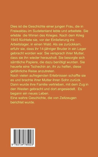 Dies ist die Geschichte einer jungen Frau, die in Freiwaldau im Sudetenland lebte und arbeitete. Sie erlebte die Wirren des Krieges. Nach dem Krieg 1945 flüchtete sie vor der Einlieferung ins Arbeitslager in einen Wald. Als sie zurückkam, erfuhr sie, dass ihr 14-jähriger Bruder ins Lager gebracht worden war. Sie versprach ihrer Mutter, dass sie ihn wieder herausholt. Sie besorgte sich sämtliche Papiere, die dazu benötigt wurden. Sie heuerte eine Tschechin an, ihr zu helfen, diese gefährliche Reise anzutreten.Nach vielen aufregenden Erlebnissen schaffte sie es und brachte ihrer Mutter ihren Sohn zurück. Dann wurde ihre Familie vertrieben, mit dem Zug in den Westen gebracht und dort angesiedelt. Es begann ein neues Leben.Eine wahre Geschichte, die von Zeitzeugen berichtet wurde.