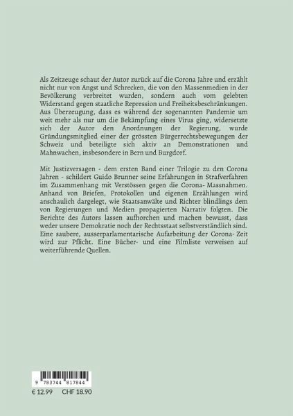 Als Zeitzeuge schaut der Autor zurück auf die Corona Jahre und erzählt nicht nur von Angst und Schrecken, die von den Massenmedien in der Bevölkerung verbreitet wurden, sondern auch vom gelebten Widerstand gegen staatliche Repression und Freiheitsbeschränkungen. Aus Überzeugung, dass es während der sogenannten Pandemie um weit mehr als nur um die Bekämpfung eines Virus ging, widersetzte sich der Autor den Anordnungen der Regierung, wurde Gründungsmitglied einer der grössten Bürgerrechtsbewegungen der Schweiz und beteiligte sich aktiv an Demonstrationen und Mahnwachen, insbesondere in Bern und Burgdorf.Mit Justizversagen - dem ersten Band einer Trilogie zu den Corona Jahren - schildert Guido Brunner seine Erfahrungen in Strafverfahren im Zusammenhang mit Verstössen gegen die Corona-Massnahmen. Anhand von Briefen, Protokollen und eigenen Erzählungen wird anschaulich dargelegt, wie Staatsanwälte und Richter blindlings dem von Regierungen und Medien propagierten Narrativ folgten. DieBerichte des Autors lassen aufhorchen und machen bewusst, dass weder unsere Demokratie noch der Rechtsstaat selbstverständlich sind. Eine saubere, ausserparlamentarische Aufarbeitung der Corona-Zeit wird zur Pflicht. Eine Bücher- und eine Filmliste verweisen auf weiterführende Quellen. www.fakepandemie.ch