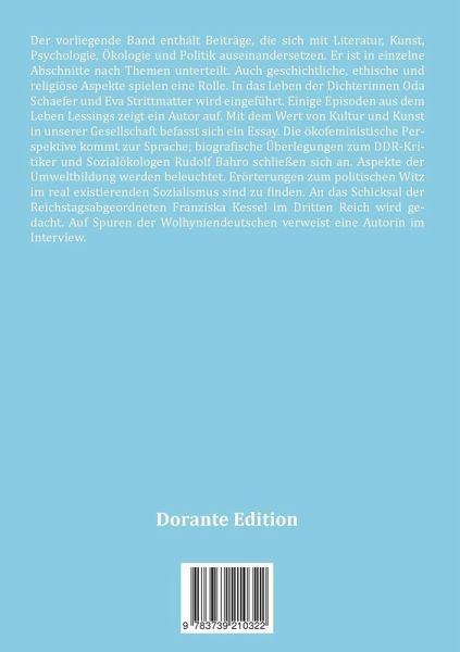 Der vorliegende Band enthält Beiträge, die sich mit Literatur, Kunst, Psychologie, Ökologie und Politik auseinandersetzen. Er ist in einzelne Abschnitte nach Themen unterteilt. Auch geschichtliche, ethische und religiöse Aspekte spielen eine Rolle. In das Leben der Dichterinnen Oda Schaefer und Eva Strittmatter wird eingeführt. Einige Episoden aus dem Leben Lessings zeigt ein Autor auf. Mit dem Wert von Kultur und Kunst in unserer Gesellschaft befasst sich ein Essay. Die ökofeministische Perspektive kommt zur Sprache; biografische Überlegungen zum DDR-Kritiker und Sozialökologen Rudolf Bahro schließen sich an. Aspekte der Umweltbildung werden beleuchtet. Erörterungen zum politischen Witz im real existierenden Sozialismus sind zu finden. An das Schicksal der Reichstagsabgeordneten Franziska Kessel im Dritten Reich wird gedacht. Auf Spuren der Wolhyniendeutschen verweist eine Autorin im Interview.