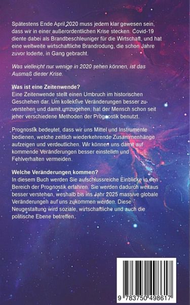 Die Weichen für ein neues Jahrzehnt werden gestelltSpätestens Ende April 2020 muss jedem klar gewesen sein, dass wir in einer außerordentlichen Krise stecken. Covid-19 diente dabei als Brandbeschleuniger für die Wirtschaft, und hat eine weltweite wirtschaftliche Brandrodung, die schon Jahre zuvor loderte, in Gang gebracht.Was vielleicht nur wenige in 2020 sehen können, ist das Ausmaß dieser Krise.Was ist eine Zeitenwende?Eine Zeitenwende stellt einen Umbruch im historischen Geschehen dar. Um kollektive Veränderungen besser zu verstehen und damit umzugehen, hat der Mensch schon seit jeher verschiedene Methoden der Prognostik benutzt.Prognostik bedeutet, dass wir uns Mittel und Instrumente bedienen, welche zeitlich wiederkehrende Zusammenhänge aufzeigen und verdeutlichen. Wir können uns damit auf kommende Veränderungen besser einstellen und Fehlverhalten vermeiden.Welche Veränderungen kommen?In diesem Buch werden Sie aufschlussreiche Einblicke in den Bereich der Prognostik erfahren. Sie werden dadurch weitaus besser verstehen, weshalb bis ins Jahr 2025 massive globale Veränderungen auf uns zukommen werden. Diese Neugestaltung wird soziale, wirtschaftliche und auch die politische Ebene betreffen.