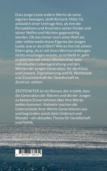 Dass junge Leute andere Werte als seine eigenen bewegen, stellt Richard, Mitte 50, anlässlich einer Umfrage fest, als ihm die Perspektiven und Ansichten seiner Kinder und seiner Neffen und Nichten gegenwärtig werden. Ob das immer noch seine Welt sei, oder mittlerweile etwas Eigenes der jungen Leute, was er da erfährt? Wie es ihm mit seinen Eltern ging, als er mit ihren Wertvorstellungen nichts anzufangen wusste, so schließt er, geht es jetzt ihm mit seinen Werten einer sehr individuellen Lebensgestaltung und den Werten der jungen Generation, für die Klima und Umwelt, Digitalisierung und KI, Wohlstand und Zusammenhalt der Gesellschaft im Zentrum stehen. ZEITFENSTER ist ein Roman, der erzählt, dass die Generation der Älteren und die der Jungen zu keinem Einvernehmen über ihre Wertewelten kommen. Vielmehr machen die Unterschiede ihrer Werte Generationen aus und begründen dabei Wandel und Umbruch - ein hoch aktuelles Thema für Gesellschaft und Politik.