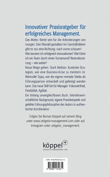 Innovativer Praxisratgeber für erfolgreiches Management.Das Motto: Bereit sein für die Anforderungen von morgen. Den Wandel gestalten! Im Geschäftsleben gibt es nur eine Richtung: nach vorne schauen!Wie lanciere ich erfolgreich Innovationen? Wie führe ich ein Team durch einen Turnaround? Restrukturierung - wie weiter? Neue Wege gehen. Stark bleiben. Konkrete Strategien, wie eine Business-Krise zu meistern ist. Wertvolle Tipps, wie die eigene mentale Stärke als Führungsperson entwickelt und gefestigt werden kann. Das neue Skill-Set für Manager: Fokussiertheit, Flexibilität, Agilität. Ein bislang unvergleichbares Buch. Betriebswirtschaftlicher Background, eigene Praxisbeispiele und gelebte Führungsphilosophie des Autors in authentischer Kombination.Folgen Sie Roman Köppel auf seinem Blog unter www.zeitgeist-management.com oder auf Instagram unter zeitgeist_management.