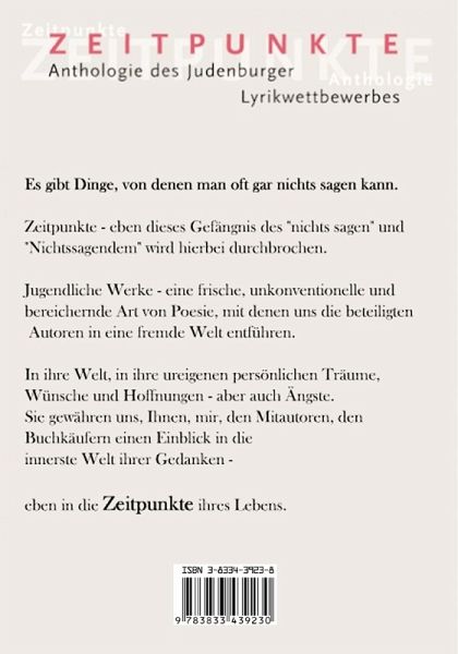 Es gibt Dinge, von denen man oft gar nichts sagen kann. Zeitpunkte ¿ eben dieses Gefängnis des "nichts sagen" und "Nichtssagendem" wird hierbei durchbrochen. Jugendliche Werke ¿ eine frische, unkonventionelle und bereichernde Art von Poesie, mit denen uns die beteiligten Autoren in eine fremde Welt entführen. In ihre Welt, in ihre ureigenen persönlichen Träume, Wünsche und Hoffnungen - aber auch Ängste. Sie gewähren uns, Ihnen, mir, den Mitautoren, den Buchkäufern einen Einblick in die innerste Welt ihrer Gedanken ¿ eben in die Zeitpunkte ihres Lebens. Diese Anthologie beinhaltet die 40 besten Werke des 1. Judenburger Lyrikwettbewerbs der Jugend. Veranstaltet wurde dieses Wettbewerb 2005 vom Bezirksjugendmanagement Judenburg unter der Leitung von Christopher Tafeit.
