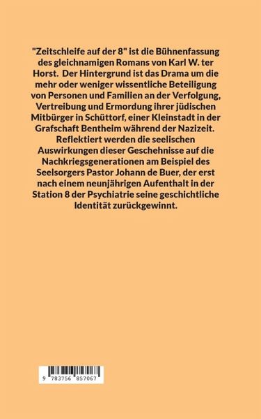 "Zeitschleife auf der 8" ist ein Drama um die mehr oder weniger wissentliche Beteiligung von Personen und Familien an der Verfolgung, Vertreibung und Ermordung ihrer jüdischen Mitbürger einer Kleinstadt in der Grafschaft Bentheim während der Nazizeit. Reflektiert werden die seelischen Auswirkungen dieser Geschehen auf die Nachkriegsgenerationen am Beispiel des Seelsorgers Pastor Johann de Buer, der erst nach einem achtjährigen Aufenthalt in der Station 8 der Psychiatrie seine geschichtliche Identität zurückgewinnt.
