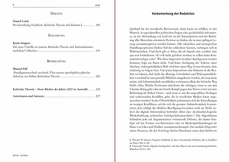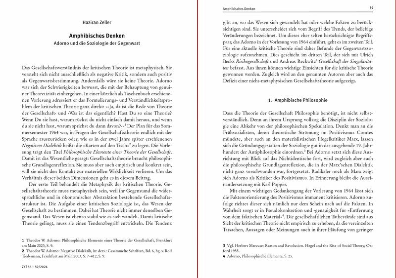 Die Zeitschrift für kritische Theorieist ein Diskussionsforum für diemateriale Anwendung kritischer Theorie auf aktuelle Gegenstände und bietet einen Rahmen für Gespräche zwischen den verschiedenen methodologischen Auffassungen heutiger Formen kritischer Theorie. Sie dient als Forum, das einzelne theoretische Anstrengungen thematisch bündelt und kontinuierlich präsentiert.www.zkt.zuklampen.de