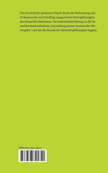 Die »Zeitschrift für spekulative Physik« wurde von F. W. J. Schelling herausgegeben und erschien in den Jahren 1800-1801 in zwei Bänden. Neben Schelling veröffentlichten hier seine Schüler Henrik Steffens und Carl August Eschenmayer. Sie diente der Verbreitung und Diskussion der von Schelling inaugurierten Naturphilosophie des Deutschen Idealismus, die seit einiger Zeit erneut an Aktualität gewonnen hat und enthält grundlegende Texte zu diesem Thema wie z. B. Schellings »Allgemeine Deduktion des dynamischen Prozesses«, welche eine systematische Theorie der Materie bietet, seine Abhandlung »Über den wahren Begriff der Naturphilosophie«, in der Schelling den eigenen Ansatz der Naturphilosophie gegenüber der Transzendentalphilosophie herausstellt, sowie Eschenmayers Aufsatz »Spontaneität = Weltseele oder das höchste Prinzip der Naturphilosophie«, der sich mit Schellings Ansatz kritisch auseinandersetzt.Der bedeutendste Beitrag ist die im zweiten Band enthaltene »Darstellung meines Systems der Philosophie« aus der Feder von Schelling, mit der die Periode der Identitätsphilosophie begann.Die Edition beruht auf Vorarbeiten zu den entsprechenden Bänden der historisch-kritischen Ausgabe der Bayerischen Akademie der Wissenschaften. Die von Schelling stammenden Texte des Erstdrucks wurden mit dem Abdruck in dessen »Sämmtlichen Werken« kollationiert und wichtige Varianten sowie die Anmerkungen, Zusätze und Korrekturen aus dem Handexemplar des Verfassers im textkritischen Apparat verzeichnet. Jeder Beitrag wird mit erklärenden Anmerkungen dem Verständnis des heutigen Lesers näher gebracht.