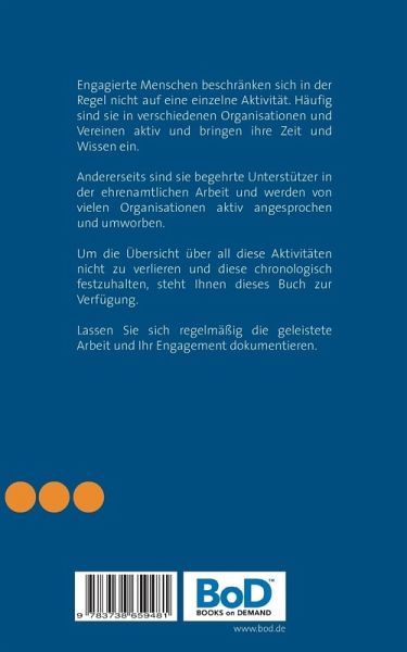 Engagierte Menschen beschränken sich in der Regel nicht auf eine einzelne Aktivität. Häufig sind sie in verschiedenen Organisationen und Vereinen aktiv und bringen ihre Zeit und Wissen ein.Andererseits sind sie begehrte Unterstützer in der ehrenamtlichen Arbeit und werden von vielen Organisationen aktiv angesprochen und umworben.Um die Übersicht über all diese Aktivitäten nicht zu verlieren und diese chronologisch festzuhalten, steht Ihnen dieses Buch zur Verfügung.Lassen Sie sich regelmäßig die geleistete Arbeit und Ihr Enga-gement dokumentieren. Zu einem späteren Zeitpunkt kann ein solcher Nachweis auch persönlichen Nutzen haben. Einerseits belegen die Bestäti-gungen die Art und Weise Ihres Engagements und die dadurch erworbenen Kenntnisse und Fähigkeiten. Andererseits stärken diese Aktivitäten Ihre soziale Kompetenz im Umgang mit Menschen. Arbeitgeber schätzen dieses Engagement außerordentlich und können Ihre Persönlichkeit noch besser einschätzen.