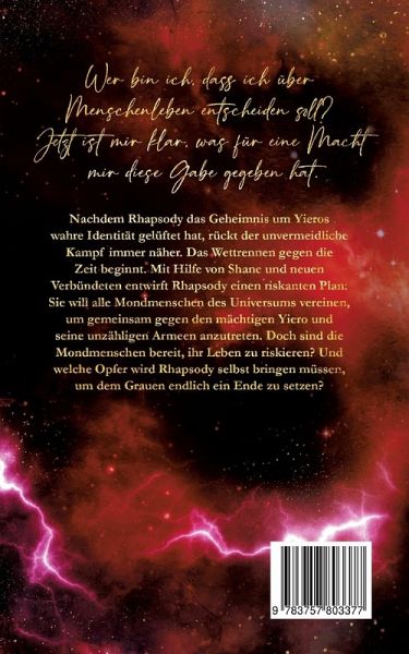 »Wer bin ich, dass ich über Menschenleben entscheiden soll? Jetzt ist mir klar, was für eine Macht mir diese Gabe gegeben hat.«Nachdem Rhapsody das Geheimnis um Yieros wahre Identität gelüftet hat, rückt der unvermeidliche Kampf immer näher. Das Wettrennen gegen die Zeit beginnt. Mit Hilfe von Shane und neuen Verbündeten entwirft Rhapsody einen riskanten Plan: Sie will alle Mondmenschen des Universums vereinen, um gemeinsam gegen den mächtigen Yiero und seine unzähligen Armeen anzutreten. Doch sind die Mondmenschen bereit, ihr Leben zu riskieren? Und welche Opfer wird Rhapsody selbst bringen…mehr