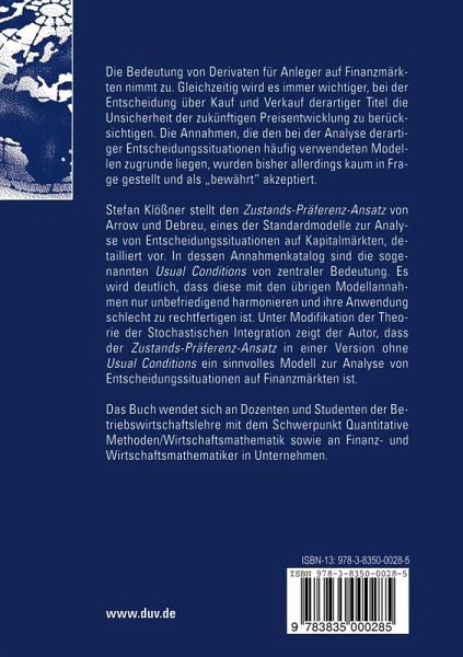 Stefan Klößner stellt den Zustands-Präferenz-Ansatz von Arrow und Debreu, eines der Standardmodelle zur Analyse von Entscheidungssituationen auf Kapitalmärkten, detailliert vor. In dessen Annahmenkatalog sind die sogenannten Usual Conditions von zentraler Bedeutung. Es wird deutlich, dass diese mit den übrigen Modellannahmen nur unbefriedigend harmonieren und ihre Anwendung schlecht zu rechtfertigen ist. Unter Modifikation der Theorie der Stochastischen Integration zeigt der Autor, dass der Zustands-Präferenz-Ansatz in einer Version ohne Usual Conditions ein sinnvolles Modell zur Analyse von Entscheidungssituationen auf Finanzmärkten ist.