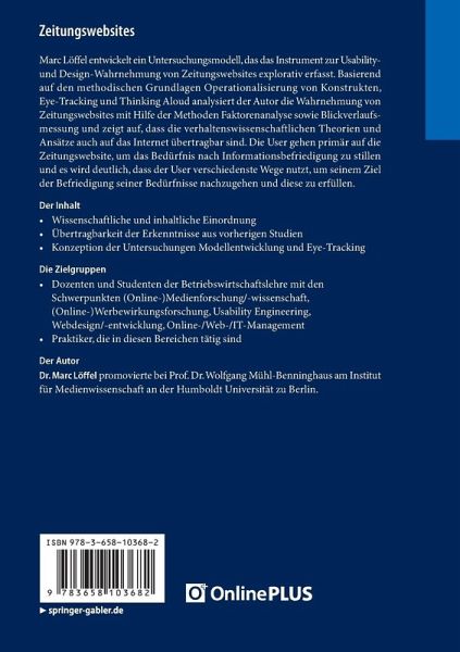 Marc Löffel entwickelt ein Untersuchungsmodell, das das Instrument zur Usability- und Design-Wahrnehmung von Zeitungswebsites explorativ erfasst. Basierend auf den methodischen Grundlagen Operationalisierung von Konstrukten, Eye-Tracking und Thinking Aloud analysiert der Autor die Wahrnehmung von Zeitungswebsites mit Hilfe der Methoden Faktorenanalyse sowie Blickverlaufsmessung und zeigt auf, dass die verhaltenswissenschaftlichen Theorien und Ansätze auch auf das Internet übertragbar sind. Die User gehen primär auf die Zeitungswebsite, um das Bedürfnis nach Informationsbefriedigung zu stillen und es wird deutlich, dass der User verschiedenste Wege nutzt, um seinem Ziel der Befriedigung seiner Bedürfnisse nachzugehen und diese zu erfüllen.