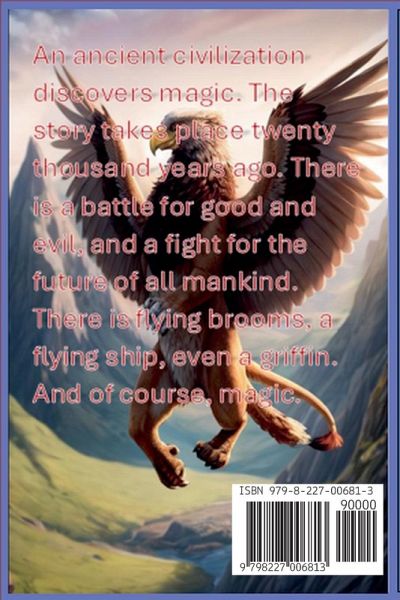 An ancient civilization discovers the use of magic. There is a fight for good and evil, flying brooms, flying ships, a griffin, and of course the use of magic. The story takes place 20000 years ago, during the last ice age.