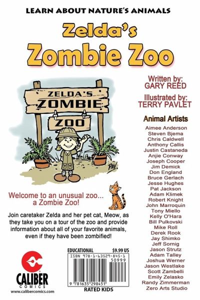 Welcome to an unusual zoo...a Zombie Zoo! Join caretaker, Zelda and her pet cat, Meow, as they take you on a tour of the zoo and provide unique information about all your favorite animals, even though they have been zombified! Geared for a young reader, each animal is drawn by a different artist and Zelda provides some fascinating facts about each as well as some of the daily activities she has to do as caretaker. The full color drawings are created by 30 guest artists.