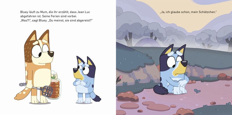 Im Camping-Urlaub lernt Bluey Jean Luc kennen. Obwohl sie nicht die gleiche Sprache sprechen, verstehen sie sich wunderbar und werden dicke Freunde. Sie pflanzen einen Baum, bauen eine Hütte und jagen ein Wildschwein ... Doch am nächsten Tag ist Jean Luc abgereist. Bluey ist untröstlich. Wird sie ihren Freund je wiedersehen?