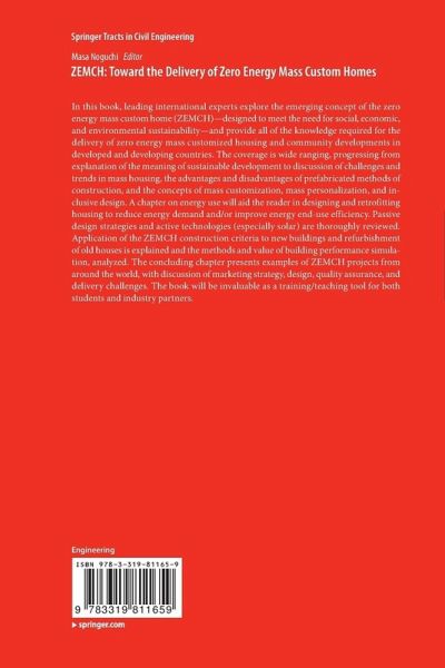 In this book, leading international experts explore the emerging concept of the zero energy mass custom home (ZEMCH) - designed to meet the need for social, economic, and environmental sustainability - and provide all of the knowledge required for the delivery of zero energy mass customized housing and community developments in developed and developing countries. The coverage is wide ranging, progressing from explanation of the meaning of sustainable development to discussion of challenges and trends in mass housing, the advantages and disadvantages of prefabricated methods of construction, and the concepts of mass customization, mass personalization, and inclusive design. A chapter on energy use will aid the reader in designing and retrofitting housing to reduce energy demand and/or improve energy end-use efficiency. Passive design strategies and active technologies (especially solar) are thoroughly reviewed. Application of the ZEMCH construction criteria to new buildings and refurbishment of old houses is explained and the methods and value of building performance simulation, analyzed. The concluding chapter presents examples of ZEMCH projects from around the world, with discussion of marketing strategy, design, quality assurance, and delivery challenges. The book will be invaluable as a training/teaching tool for both students and industry partners.