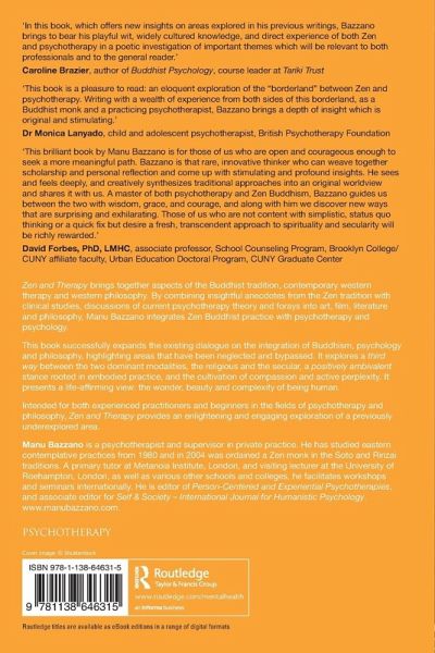 Zen and Therapy brings together aspects of the Buddhist tradition, contemporary western therapy and western philosophy. By combining insightful anecdotes from the Zen tradition with clinical studies, discussions of current psychotherapy theory and forays into art, film, literature and philosophy, Manu Bazzano integrates Zen Buddhist practice with psychotherapy and psychology. This book successfully expands the existing dialogue on the integration of Buddhism, psychology and philosophy, highlighting areas that have been neglected and bypassed. It explores a third way between the two dominant modalities, the religious and the secular, a positively ambivalent stance rooted in embodied practice, and the cultivation of compassion and active perplexity. It presents a life-affirming view: the wonder, beauty and complexity of being human. Intended for both experienced practitioners and beginners in the fields of psychotherapy and philosophy, Zen and Therapy provides an enlightening and engaging exploration of a previously underexplored area.