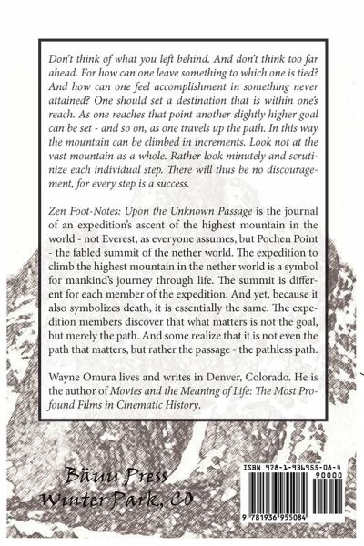 pDon't think of what you left behind. And don't think too far ahead. For how can one leave something to which one is tied? And how can one feel accomplishment in something never attained? One should set a destination that is within one's reach. As one reaches that point another slightly higher goal can be set - and so on, as one travels up the path. In this way the mountain can be climbed in increments. Look not at the vast mountain as a whole. Rather look minutely and scrutinize each individual step. There will thus be no discouragement, for every step is a success./p piZen Foot-Notes: Upon the Unknown Passage/i is the journal of an expedition's ascent of the highest mountain in the world - not Everest, as everyone assumes, but Pochen Point - the fabled summit of the nether world. The expedition to climb the highest mountain in the nether world is a symbol for mankind's journey through life. The summit is different for each member of the expedition. And yet, because it also symbolizes death, it is essentially the same. The expedition members discover that what matters is not the goal, but merely the path. And some realize that it is not even the path that matters, but rather the passage - the pathless path./p pWayne Omura lives and writes in Denver, Colorado. He is the author of iMovies and the Meaning of Life: The Most Profound Films in Cinematic History/i./p