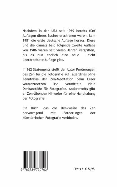 Nachdem in den USA seit 1969 bereits fünf Auflagen dieses Buches erschienen waren, kam 1981 die erste deutsche Auflage heraus. Diese und die damals bald folgende zweite Auflage von 1986 waren seit vielen Jahren vergriffen, bis es nun endlich eine neue leicht überarbeitete Auflage gibt. In 162 Statements stellt der Autor Forderungen des Zen für die Fotografie auf, allerdings ohne Kenntnisse der Zen-Meditation beim Leser vorauszusetzen und vermittelt viele Denkanstöße für Fotografen. Andererseits gibt er Zen-Übenden Hinweise für eine Handhabung der Fotografie.Ein Buch, das die Denkweise des Zen hervorragend mit Forderungen der künstlerischen Fotografie verbindet.