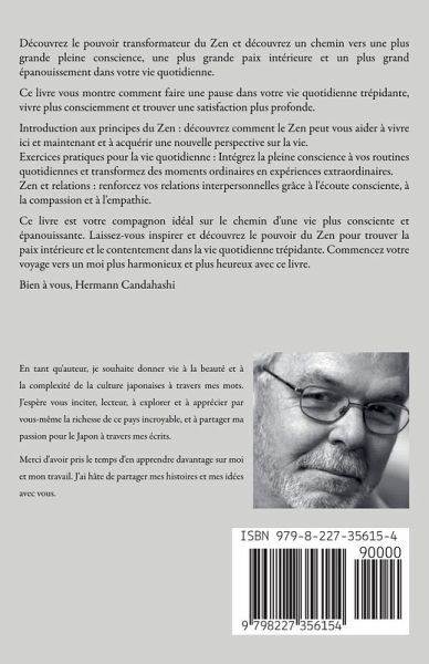 "Zen - l'art de vivre consciemment - instructions pour une attitude de vie moderne et épanouie" Bienvenue dans un monde de pleine conscience et d'harmonie intérieure. Nos vies sont souvent trépidantes et accablantes. Mon livre "Zen - l'art de vivre consciemment - instructions pour une attitude de vie moderne et épanouie" peut également vous aider à expérimenter une perspective calme et claire et à remplir votre vie de paix et de détente. Ce livre est un guide complet pour intégrer les pratiques Zen dans votre vie quotidienne afin de vivre une vie plus consciente, épanouissante et équilibrée. Il s'adresse à toute personne qui aspire à la paix intérieure et souhaite apporter davantage de pleine conscience dans sa vie quotidienne. Le Zen est une pratique vieille de plusieurs milliers d'années et trouve ses origines dans la tradition bouddhiste. Il s'agit d'apaiser l'esprit, de vivre le moment présent et de regarder le monde avec des yeux clairs et ouverts. Le Zen nous apprend à apprécier la vie dans sa simplicité et sa beauté et à trouver la paix intérieure, quelles que soient les circonstances extérieures. La nature joue un rôle central dans le Zen. Découvrez comment la connexion avec la nature peut vous aider à acquérir une vision plus profonde et un sentiment de connexion avec le monde qui vous entoure. Les promenades en forêt, l'observation des plantes et des animaux et l'expérience consciente des saisons sont des méthodes puissantes pour pratiquer la pleine conscience et trouver la paix intérieure. Une partie essentielle du Zen est la capacité de lâcher prise. Dans ce chapitre, vous apprendrez à abandonner les pensées et les émotions négatives pour faire place aux expériences et aux sentiments positifs. Grâce à des exercices pratiques et à des méditations, vous apprendrez comment vous libérer des schémas de pensée stressants et mener une vie plus facile et plus libre. Le Zen peut également avoir un effet profond sur nos relations interpersonnelles. Mon livre propose des conseils sur la façon dont vous pouvez créer des relations plus harmonieuses et épanouissantes grâce à la pleine conscience et à la compassion. Vous apprendrez à établir une connexion plus profonde avec ceux qui vous entourent grâce à une écoute consciente, de la patience et de l'empathie. Le Zen peut avoir un impact positif sur notre santé physique et mentale. Découvrez comment la pleine conscience et la méditation peuvent réduire le stress, renforcer le système immunitaire et contribuer à un sentiment général de bien-être. Des conseils pratiques et des exercices vous montrent comment intégrer les pratiques zen à votre routine santé. Ce livre vous encourage à suivre le chemin du Zen. Cela vous rappelle que le Zen est un voyage qui dure toute la vie - un voyage vers une plus grande conscience, une plus grande paix et un plus grand épanouissement. En fin de compte, ce livre est bien plus qu'une simple introduction à la pratique du Zen. C'est un compagnon sur votre chemin vers une vie plus consciente, épanouissante et harmonieuse. Plongez dans l'art du Zen et découvrez les possibilités infinies cachées à chaque instant. Bien à vous, Hermann Candahashi