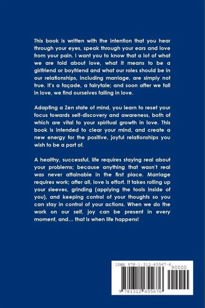 Adapting a Zen state of mind, you learn to reset your focus towards self-discovery and awareness, both of which are vital to your spiritual growth in love. This book is intended to clear your mind, and create a new energy for the positive, joyful relationships you wish to be a part of. A healthy, successful, life requires staying real about your problems; because anything that wasn't real was never attainable in the first place. Marriage requires work; after all, love is effort. It takes rolling up your sleeves, grinding (applying the tools inside of you), and keeping control of your thoughts so you can stay in control of your actions. When we do the work on our self, joy can be present in every moment, and... that is when life happens!