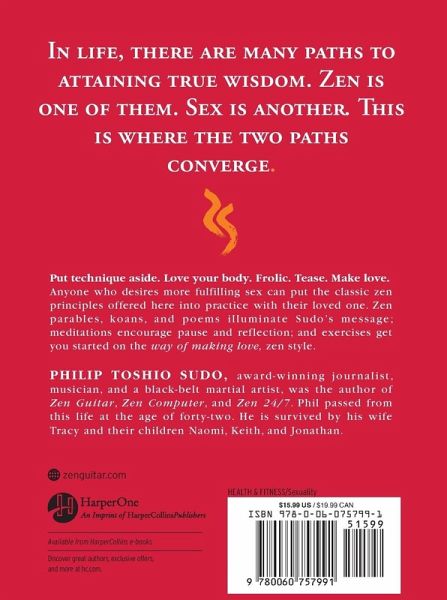 Zen philosophy tells us that the great truth of the universe applies to all things at all times. Every moment of life, from guitar playing to working at the computer, to making love, offers a chance for Zen realization. Just awaken to that truth, Zen masters say; how and where do not matter. Sex offers the same opportunity for enlightenment as anything else. Zen Sex guides readers to the realization of that opportunity with "The Ten Stages of Zen Sex" and "The Six Principles in the Way of Making Love." Philip Sudo reminds our sex-obsessed age that not only is sex a fundamentally spiritual endeavour, it is indeed sacred. This elegant, gorgeous book will appeal not only to Zen practitioners, but to any one looking for enlightenment and spirituality in all aspects of life. Great gift potential. Good for the sex book audience, Zen practitioners and readers looking for meaningful sex. While there are quite a few books that deal with spirituality and sex from the Tantric and Taoist tradition, no other book has brought together Zen and sex. Easy-to-do practices help readers learn and experience Zen sex.Hinweis: Dieser Artikel kann nur an eine deutsche Lieferadresse ausgeliefert werden.