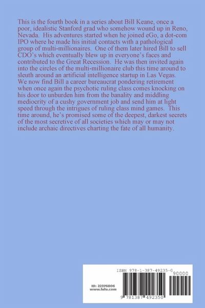 4th in the Bill Keane series, we find Bill a career bureaucrat pondering retirement when once again the psychotic ruling class comes knocking on his door to unburden him from the banality and middling mediocrity of a cushy government job and send him at light speed through the intrigues of ruling class mind games. This time around, he's promised some of the deepest, darkest secrets of the most secretive of all societies which may or may not include archaic directives charting the fate of all humanity.