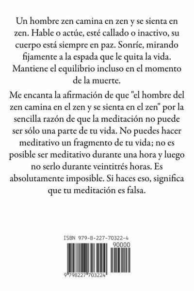 Un hombre zen camina en zen y se sienta en zen. Hable o actúe, esté callado o inactivo, su cuerpo está siempre en paz. Sonríe, mirando fijamente a la espada que le quita la vida. Mantiene el equilibrio incluso en el momento de la muerte. Me encanta la afirmación de que "el hombre del zen camina en el zen y se sienta en el zen" por la sencilla razón de que la meditación no puede ser sólo una parte de tu vida. No puedes hacer meditativo un fragmento de tu vida; no es posible ser meditativo durante una hora y luego no serlo durante veintitrés horas. Es absolutamente imposible. Si haces eso, significa que tu meditación es falsa.