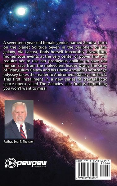 In this thrilling space opera, a seventeen-year-old female genius named Zendra, born on the planet Solitude Seven in the periphery of the galaxy, Via Lactea, finds herself at the center of a galactic conflict that will test her prodigious abilities to the fullest. When the malevolent leader Drang the Gray of Triangulum Galaxy and his Horde Armada threaten the very existence of the human race, Zendra must rise to the occasion and use her genius-level intellect to save humanity from implacable ruin. Set against the vast backdrop of the Virgo Supercluster of Galaxies, "Zendra of the Periphery" is the first installment in Seth T. Thatcher's new series, "The Galaxies Like Dust." This transgalactic space opera blends cutting-edge science fiction with high-stakes drama, as Zendra navigates the complexities of interstellar politics and confronts the challenges of ensuring humanity's survival in a universe teetering on the brink of annihilation. With its compelling protagonist, imaginative worldbuilding, and thrilling plot twists, "Zendra of the Periphery" is a must-read for fans of epic science fiction and those who dream of humanity's future among the stars.