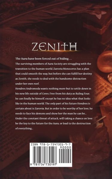 The Aura have been forced out of hiding.... The surviving members of Aura Society are struggling with the transition to the human world. Zarovia Monoceros has a plan that could smooth the way, but before she can fulfill her destiny as Zenith, she needs to deal with the handsome distraction under her own roof. Hendrex Andromeda wants nothing more but to settle down in his new life outside of Ceres. Free from his duty as Ruling Four, he can finally be himself, except he has no idea what that looks like in the human world. The only part of his future Hendrex is certain about is Zarovia. But in order to be worthy of her love, he needs to face his demons and show her the man he can be... Under the constant threat of attack, will taking a chance on love be the key to the future for the Aura, or lead to the destruction of everything...