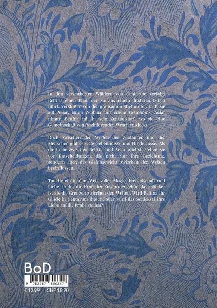 In den verzauberten Wäldern von Centarum verfolgt Bettina einen Pfad, der sie aus einem düsteren Leben führt. Verstoßen von der grausamen Stiefmutter, trifft sie auf Aelar, einen Zentaur mit einem Geheimnis. Aelar nimmt Bettina mit in sein Zentaurdorf, wo sie eine Gemeinschaft von faszinierenden Wesen entdeckt.Doch zwischen den Welten der Zentauren und der Menschen gibt es viele Geheimnisse und Hindernisse. Als die Liebe zwischen Bettina und Aelar wächst, stehen sie vor Entscheidungen, die nicht nur ihre Beziehung, sondern auch das Gleichgewicht zwischen den Welten beeinflussen.Tauche ein in eine Welt voller Magie, Freundschaft und Liebe, in der die Kraft der Zusammengehörigkeit stärker ist als die Grenzen zwischen den Welten. Wird Bettina ihr Glück in Centarum finden, oder wird das Schicksal ihre Liebe auf die Probe stellen?