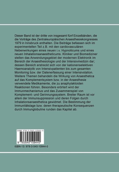 Freie Themen Experimentelle und klinisch-experimentelle Anaesthesie.- Sevofluran: Kreislaufwirkungen und myokardiale Sauerstoffversorgung im Vergleich zu Halothan.- Zur Beeinflussung der Intestinalmotorik durch Anaesthe-tika.- Einfluß von Pancuroniumbromid auf die Spontanmotilität des Hundedarms.- Beeinflussung des Elektrolyt- und Wassertransports am Dünndarm durch Enfluran.- Beeinflussung des Hexose-Transports an epithelialen Strukturen durch Inhalationsanaesthetika.- Einfluß mäßiger arterieller Hypotension und Hemmung des transmembranalen Glucosetransports auf Durchblutung und Stoffwechsel des Gehirns beim Hund.- Anaesthetika und Kontraktilität menschlicher Bronchialmuskulatur.- In-vivo- und in-vitro-Wirkung von Etomidate auf die Pseudo-cholinesterase-Aktivität im Serum.- Beta-Blocker-Therapie während einer Allgemeinnarkose. Experimentelle und klinische Untersuchungen.- Einfluß der Beatmungsparameter auf den Hirndruck.- Effects of Barbiturates and of Promethazine on Lipid Peroxidation in Brain Tissue.- Neurophysiologische Untersuchungen mit endorphin-ähnlichen Substanzen.- Endorphine-endogene Analgetika bei der Geburt?.- Biochemische und morphologische Veränderungen nach isovolämischer Hämodilution mit verschiedenen stroma-freien polymerisierten Hämoglobinlösungen im Tierexperiment.- Kardiovasculäre Wirkungen von Midazolam (Ro 21-3981), einem neuen wasserlöslichen Benzodiazepin.- Pharmakodynamische Wirkungen und Nebenwirkungen eines neuen Benzodiazepin-Derivates am Menschen.- Midazolam as an Induction Agent for Anaesthesia: A Study in Volunteers.- Klinisch experimentelle Untersuchungen mit dem neuen i.v. Hypnoticum Ro 21-3981 (Midazolam).- Experimentelle und klinische Untersuchungen zur Verwendung verschiedener Narkosesysteme im Säuglingsalter.-Freie Themen Technik und Monitoring.- Erste Erfahrungen mit einem Mikroprozessor gesteuerten Monitorsystem.- Kationenselektive Hämoanalytik mit Carrier-Membran-Disk-Elektroden.- Bedside-Monitoring des Blutzuckers. Vergleich von Blutzuckerbestimmungen mit dem Reflomaten und einer photometrisch-enzymatischen Labormethode (GOD-Perid).- EEG-Parameter und Monitoring der Narkosetiefen.- Automatische Blutdruckmessung auf der Basis der Oszillo-metrie: Vergleich mit Doppler, Riva Rocci und intraarterieller Messung.- Erfahrungen mit der atemphasengesteuerten Cuffblähung.- Impulsgesteuerte Gasmischung - ein einfaches Verfahren zur Aufbereitung von Beatmungsgasen.- Ein elektronisch gesteuertes Anaesthesiegerät mit Einspritzverdampfer.- Das Dokumentations- und Informationssystem des Instituts für Anaesthesiologie im Klinikum Steglitz der FU Berlin.- Freie Themen Anaesthesie und EEG.- Wertung der Prämedikation anhand von EEG-Frequenz-analysen.- Typische Veränderungen der elektrischen Hirnaktivität bei Halothannarkose.- Spezifische Veränderungen der elektrischen Hirnaktivität nach i.v. Ketanest-Gabe; Wertung des Narkoseeffekts bei unterschiedlichen Dosierungen.- EEG-Veränderungen nach Etomidate mit Berücksichtigung unterschiedlicher Dosierungen.- Panel I Immunologische Aspekte in der Anaesthesie und Intensivmedizin.- Begrüßung.- Immunologische Aspekte in der Anaesthesiologie (Einführung).- Effects of Intravenous Anaesthetics on the Complement System.- Der Einfluß von Halothan und Neuroleptanaesthesie auf die T-Zell-Funktion gesunder Probanden.- Anaphylaktoide Reaktionen nach Infusion von Volumenersatzmitteln - Beispiele für die Verschiedenartigkeit von Mechanismen der Arzneimittelüberempfindlichkeit.- Immunologische Aspekte in der postoperativen Phase(Intensivmedizin).- Zusammenfassung: Immunologische Aspekte in der Anaesthesiologie.- Freie Themen Immunologie.- Halothane, the Liver and Autoimmune Disease.- Das Verhalten der Immunglobuline IgG, IgM, IgA unter Operation, Anaesthesie und im postoperativen Verlauf.- Untersuchungen zur Lymphozytenstimulierbarkeit unter Operation und Anaesthesie.- Immunglobulinspiegel-Bestimmung bei einem chirurgischseptischen Patientengut mittels Laser-Nephelometrie.- Einfluß schwerer Infektionen auf die Plasmaspiegel von IgG, IgM und IgA bei Intensivpatienten.- Medikamentöse Blockade der Pathergiequote von Neo-Plasmagel durch Promethazin bei einer orthopädischen Operationspopulation.- Immunsupression durch Halothan, Ketamin und Bupivacain - Eine tierexperimentelle Vergleichsstudie mit Balb/c-Mäusen.