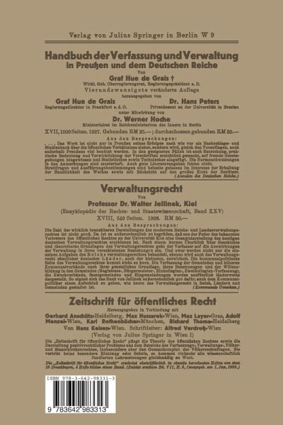 Erstes Kapitel Begriff und Arten von Zentralisation und Dezentralisation.- I. Begriffsbestimmung.- II. Arten von Zentralisation und Dezentralisation.- Zweites Kapitel Verhältnis von Zentralisation und Dezentralisation zu anderen staatsrechtlichen Institutionen..- I. Selbstverwaltung.- II. Demokratie.- III. Absolutismus, Diktatur.- IV. Gewaltenteilung.- V. Monarchie und Republik.- VI. Unitarismus und Föderalismus.- Drittes Kapitel Vorzüge von Zentralisation und Dezentralisation..- I. Vorbemerkung.- II. Vorzüge der Zentralisation.- III. Vorzüge der Dezentralisation.- IV. Abwägung der Vorzüge gegeneinander.- Viertes Kapitel Zentralisation und Dezentralisation in Aufbau und Verwaltung der Staaten..- I. Vorbemerkung.- II. Völkerrechtsgemeinschaft.- III. Kolonien.- IV. Das Britische Empire.- V. Die Bundesstaaten.- VI. Die Gliederung im Einheitsstaat.- Fünftes Kapitel Zentralisation und Dezentralisation in der Verfassungsund Verwaltungsreform in Deutschland..- I. Das Reich ein dezentralisierter Einheitsstaat?.- II. Dekonzentration in Reich und Ländern?.- III. Landkreis oder Großstadt?.