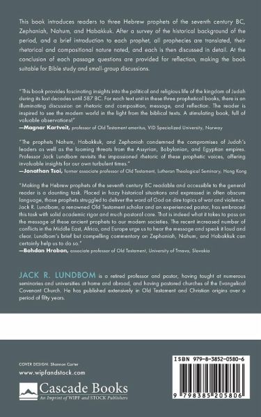 This book introduces readers to three Hebrew prophets of the seventh century BCE, Zephaniah, Nahum, and Habakkuk. After a survey of the historical background of the period, and a brief introduction to each prophet, all prophecies are translated, their rhetorical and compositional nature noted, and each is then discussed in detail. At the conclusion of each passage questions are provided for reflection, making the book suitable for Bible study and small-group discussions.