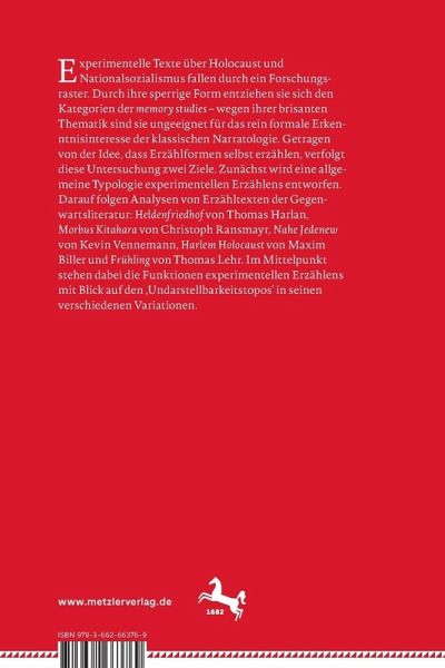 Experimentelle Texte über Holocaust und Nationalsozialismus fallen durch ein Forschungsraster. Durch ihre sperrige Form entziehen sie sich den Kategorien der memory studies - wegen ihrer brisanten Thematik sind sie ungeeignet für das rein formale Erkenntnisinteresse der klassischen Narratologie. Getragen von der Idee, dass Erzählformen selbst erzählen, verfolgt diese Untersuchung zwei Ziele. Zunächst wird eine allgemeine Typologie experimentellen Erzählens entworfen. Darauf folgen Analysen von Erzähltexten der Gegenwartsliteratur: Heldenfriedhof von Thomas Harlan, Morbus Kitahara von Christoph Ransmayr, Nahe Jedenew von Kevin Vennemann, Harlem Holocaust von Maxim Biller und Frühling von Thomas Lehr. Im Mittelpunkt stehen dabei die Funktionen experimentellen Erzählens mit Blick auf den 'Undarstellbarkeitstopos' in seinen verschiedenen Variationen.
