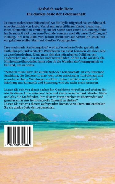 In "Zerbrich mein Herz: Die dunkle Seite der Leidenschaft" führt Julian Lieblich die Leser in eine Welt, in der Liebe und Rache auf gefährliche Weise miteinander verflochten sind. Die Geschichte folgt einer Reihe komplexer Charaktere, die von ihren tiefsten Wünschen, Ängsten und Ambitionen getrieben werden, während sie sich durch ein Netz aus Leidenschaft, Verrat und Vergeltung navigieren.Die Geschichte beginnt mit Elena, die nach einer schmerzhaften Trennung einen Neuanfang sucht. Ihre Reise führt sie zu einem kleinen Küstendorf, wo sie im Strandcafé neue Freunde findet und unvergessliche…mehr