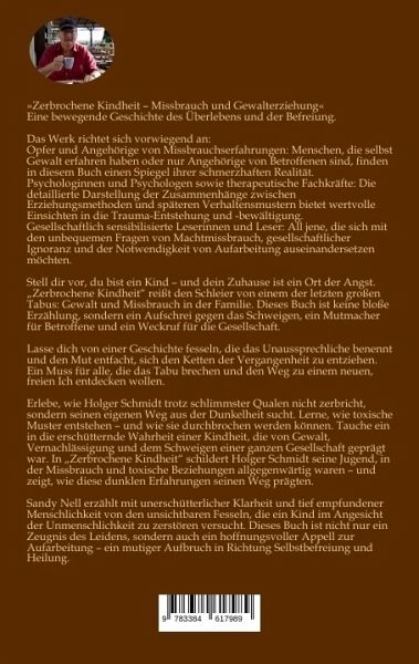 Zerbrochene Kindheit - Missbrauch und Gewalterziehung -Eine bewegende Geschichte des Überlebens und der BefreiungStell dir vor, du bist ein Kind - und dein Zuhause ist ein Ort der Angst. "Zerbrochene Kindheit" reißt den Schleier von einem der letzten großen Tabus: Gewalt und Missbrauch in der Familie. Dieses Buch ist keine bloße Erzählung, sondern ein Aufschrei gegen das Schweigen, ein Mutmacher für Betroffene und ein Weckruf für die Gesellschaft.Lasse dich von einer Geschichte fesseln, die das Unaussprechliche benennt und den Mut entfacht, sich den Ketten der Vergangenheit zu entziehen. Ein Muss für alle, die das Tabu brechen und den Weg zu einem neuen, freien Ich entdecken wollen.Erlebe, wie Holger Schmidt trotz schlimmster Qualen nicht zerbricht, sondern seinen eigenen Weg aus der Dunkelheit sucht. Lerne, wie toxische Muster entstehen - und wie sie durchbrochen werden können. Tauche ein in die erschütternde Wahrheit einer Kindheit, die von Gewalt, Vernachlässigung und dem Schweigen einer ganzen Gesellschaft geprägt war. In "Zerbrochene Kindheit" schildert Holger Schmidt seine Jugend, in der Missbrauch und toxische Beziehungen allgegenwärtig waren - und zeigt, wie diese dunklen Erfahrungen seinen Weg prägten.Sandy Nell erzählt mit unerschütterlicher Klarheit und tief empfundener Menschlichkeit von den unsichtbaren Fesseln, die ein Kind im Angesicht der Unmenschlichkeit zu zerstören versucht. Dieses Buch ist nicht nur ein Zeugnis des Leidens, sondern auch ein hoffnungsvoller Appell zur Aufarbeitung - ein mutiger Aufbruch in Richtung Selbstbefreiung und Heilung. Dieses Buch solltest du kaufen, weil es bewegt, aufklärt und Hoffnung schenkt. Es gibt den Opfern eine Stimme und macht Mut, das Schweigen zu brechen. Wer "Zerbrochene Kindheit" liest, erkennt: Es ist nie zu spät, sich zu befreien - und Menschlichkeit beginnt mit Hinschauen und Handeln. Lass dich von einer wahren Geschichte berühren, die dich nicht mehr loslässt.