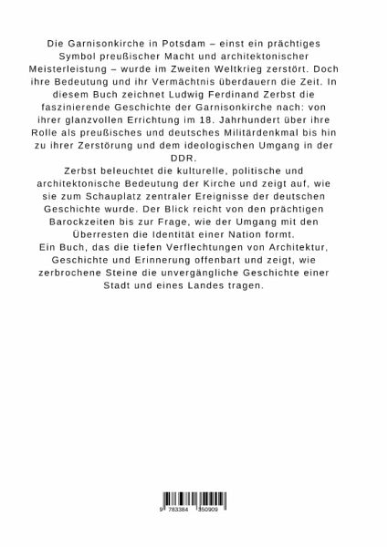 Die Garnisonkirche in Potsdam - einst ein prächtiges Symbol preußischer Macht und architektonischer Meisterleistung - wurde im Zweiten Weltkrieg zerstört. Doch ihre Bedeutung und ihr Vermächtnis überdauern die Zeit. In diesem Buch zeichnet Ludwig Ferdinand Zerbst die faszinierende Geschichte der Garnisonkirche nach: von ihrer glanzvollen Errichtung im 18. Jahrhundert über ihre Rolle als preußisches und deutsches Militärdenkmal bis hin zu ihrer Zerstörung und dem ideologischen Umgang in der DDR.Zerbst beleuchtet die kulturelle, politische und architektonische Bedeutung der Kirche und zeigt auf, wie sie zum Schauplatz zentraler Ereignisse der deutschen Geschichte wurde. Der Blick reicht von den prächtigen Barockzeiten bis zur Frage, wie der Umgang mit den Überresten die Identität einer Nation formt.Ein Buch, das die tiefen Verflechtungen von Architektur, Geschichte und Erinnerung offenbart und zeigt, wie zerbrochene Steine die unvergängliche Geschichte einer Stadt und eines Landes tragen.