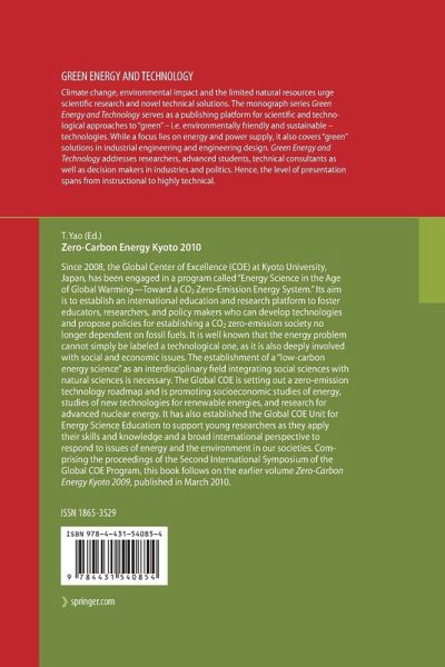 Since 2008, the Global Center of Excellence (COE) at Kyoto University, Japan, has been engaged in a program called "Energy Science in the Age of Global Warming-Toward a CO 2 Zero-Emission Energy System." Its aim is to establish an international education and research platform to foster educators, researchers, and policy makers who can develop technologies and propose policies for establishing a CO 2 zero-emission society no longer dependent on fossil fuels. It is well known that the energy problem cannot simply be labeled a technological one, as it is also deeply involved with social and economic issues. The establishment of a "low-carbon energy science" as an interdisciplinary field integrating social sciences with natural sciences is necessary. The Global COE is setting out a zero-emission technology roadmap and is promoting socioeconomic studies of energy, studies of new technologies for renewable energies, and research for advanced nuclear energy. It has also established the Global COE Unit for Energy Science Education to support young researchers as they apply their skills and knowledge and a broad international perspective to respond to issues of energy and the environment in our societies. Comprising the proceedings of the Second International Symposium of the Global COE Program, this book follows on the earlier volume Zero-Carbon Energy Kyoto 2009 , published in March 2010.