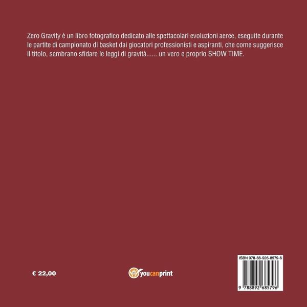Zero Gravity è un libro fotografico dedicato alle spettacolari evoluzioni aeree, eseguite durante le partite di campionato di basket dai giocatori professionisti e aspiranti, che come suggerisce il titolo, sembrano sfidare le leggi di gravità...... un vero e proprio SHOW TIME.
