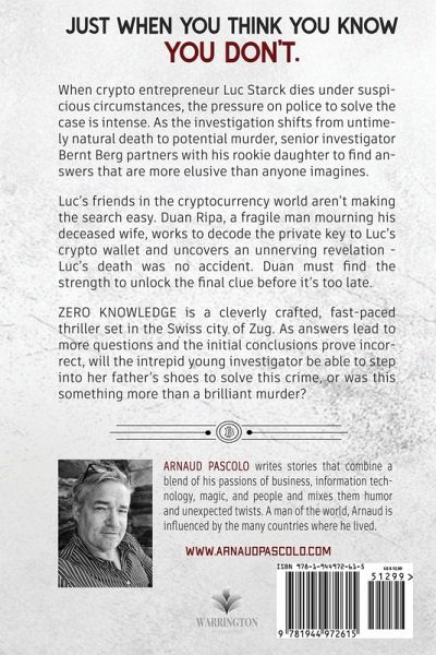 Just when you think you know all the answers...you don't. Arnaud Pascolo's latest international crime thriller is more than an intense whodunit or police procedural - it's a gripping mystery that begins with a shock and never lets you come up for air! You have to do more than put together the pieces and find the villain - you have to figure out the crime! Crypto company BionTic is facing financial difficulties, but a strange text message gives Luc Stark hope for a brighter future. The meeting invitation results in his being handed an envelope labeled "Clue One," which he is instructed to open after leaving. Moments later, the man answers a phone call, and Luc suddenly collapses and dies. When police detectives begin looking into the strange death, they learn that is only the beginning of the mystery. "The storyline was fast-moving, and I found myself unable to turn the pages quickly enough, fearful that I would miss something important." -- Alma Boucher for Readers' Favorite Who is behind this unique murder, and what is the motive? When crypto entrepreneur Luc Starck dies under suspicious circumstances in the heart of Switzerland's crypto valley, the pressure on police to solve the case is intense. As the investigation shifts from untimely natural death to potential murder, senior investigator Bernt Berg partners with his rookie daughter to find answers that are more elusive than anyone imagines. Luc's friends in the cryptocurrency world aren't making the search for answers easy. Duan Ripa, a fragile man mourning his deceased wife, works outside of the police to decode the private key to Luc's crypto wallet and uncovers an unnerving revelation - Luc's death was no accident. Faced with a life-and-death race against the clock, Duan must find the strength to unlock the final clue before it's too late. Zero Knowledge is a cleverly crafted, fast-paced thriller set in the Swiss city of Zug. As answers lead to more questions and the initial conclusions prove incorrect, will the intrepid young investigator be able to step into her father's shoes to solve this crime, or is this something more than a brilliant murder? "Deeply rooted in reality, the word-building of this narrative skillfully conveys the excitement of anonymity. Its capacity to defy genre boundaries is evident as it reads as literary fiction at first, then as a cyber thriller, and lastly as a revenge story." -- The Feathered Quill